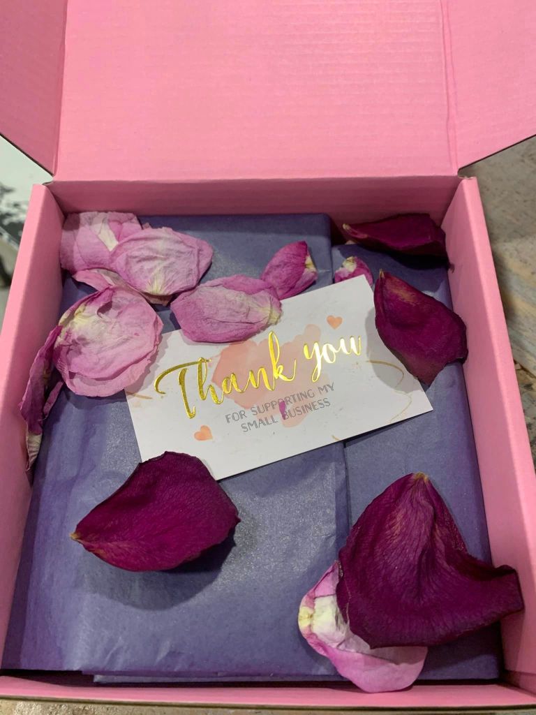 Everything I package now is paper or recycled paper product. I have my signature pink Soap SUDuction box with my stamp on the inside. Plus a piece of purple tissue paper to gather the soaps together, and a thank you card for marketing purposes.Unforgettable Soaps“We are environmentally conscientious, so our soaps are packaged in cardboard which is biodegradable. Our body butters and foaming sugar scrubs are packaged in reusable plastic containers. We encourage our clients to recycle, and we’ve also recently started asking our customers to return their plastics to us for a discount.Unforgettable Soaps packaging